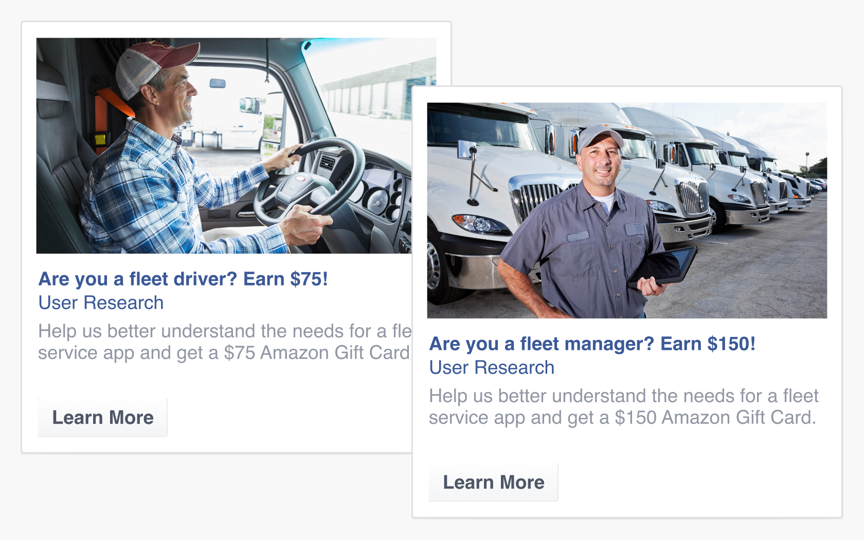 To find the right interview candidates, I worked with our marketing team to create some Facebook ads and recruit fleet business owners, fleet managers, and fleet drivers. We then put together a quick qualification survey to help narrow down our best choices. After interviews with these fleet employees, we found several key pain points and needs.