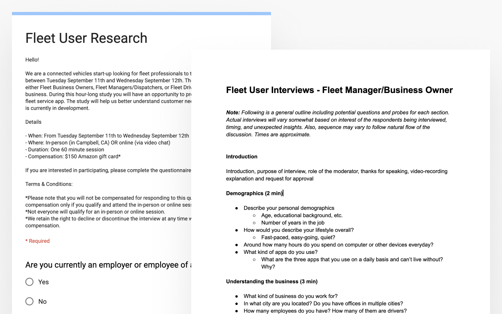 In order to understand the needs for providing a fleet management solution, I teamed up with a another product designer to conduct several interviews with various employees in the fleet industry. Together, we created a discussion guide to help us discover and understand their day-to-day experiences.
